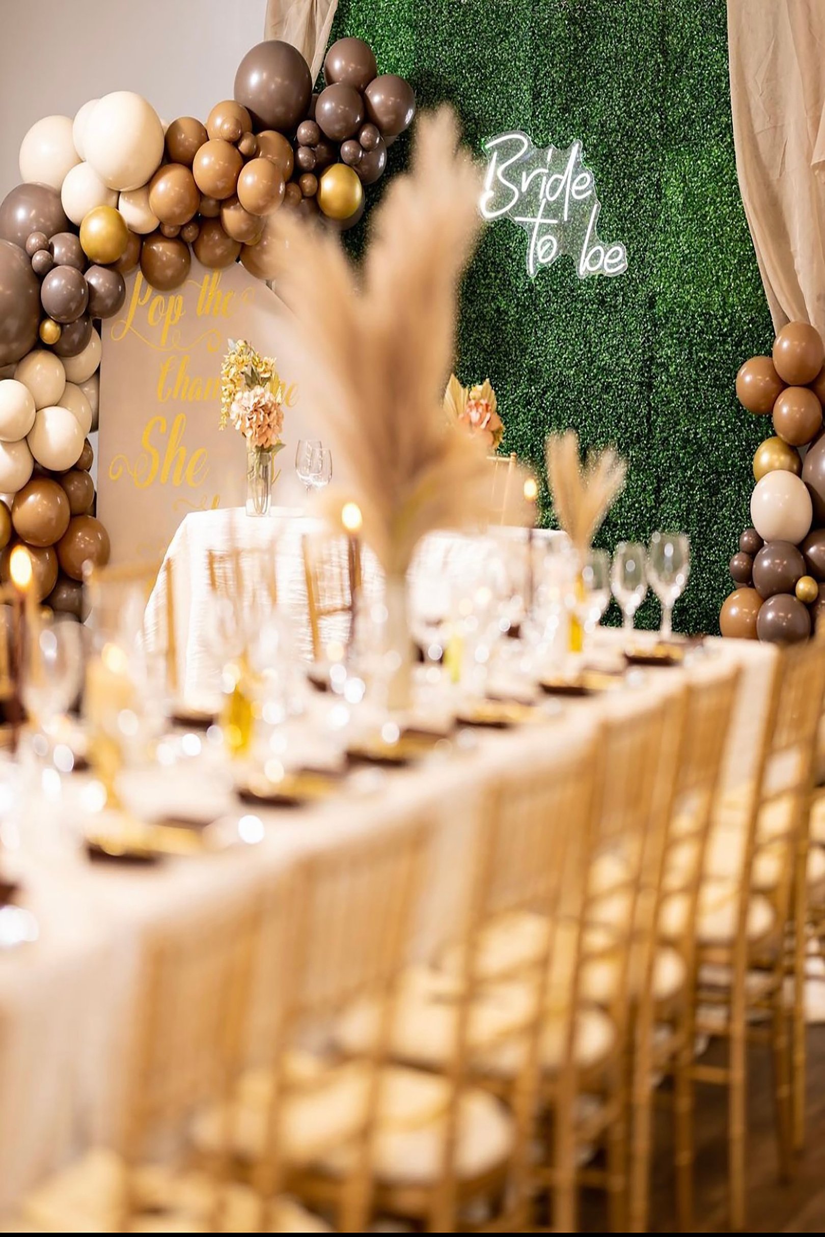 Choose from our variety of rentals including a silver shimmer or grass backdrop wall, gold rectangular and circular arches, LED custom neon signs, white or pink bounce houses, baby stroller, props & more! Rent items for the entire duration of your event and we will handle the drop-off and pick-up!