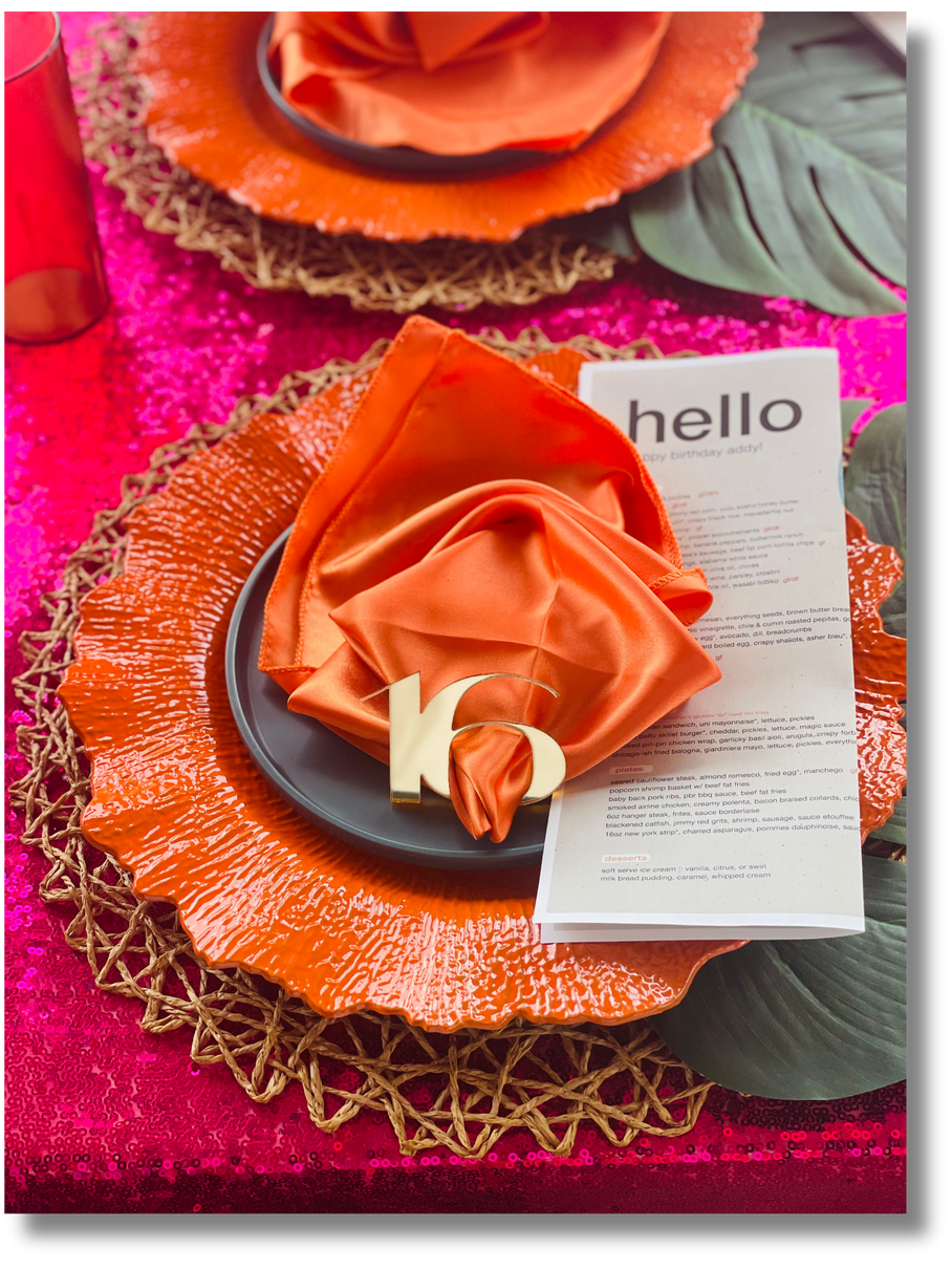 We offer custom centerpieces and tablescape designs to fit your unique theme and esthetic using fabrics, chargers, flatware, glassware, candles, florals and more!